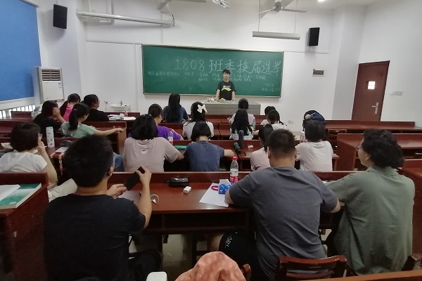孔宇对1808班上一届班委的工作结果进行总结,并回顾了同学们在上一学年的出彩表现。总结结束后,各个班委顺序发言,表达了自己工作的心得和体会以及对同学们的感谢,鼓励同学们担任新任班委。随后新任班委通过同学们的投票竞选上任,新人班长兼团支部副书记蔡子浮 表示会努力建设班集体,增强集体荣誉感,号召同学们团结一致为班级建设添砖加瓦。