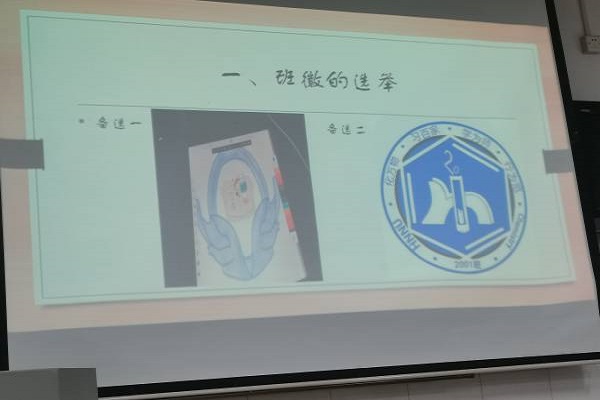 此次会议主要是对班服·班徽·班歌进行投票选举,整个投票过程采用电子投票的方式。会议第一项进行班徽的选举,共有两项作品参加,由陶茂森和唐嘉庆两位同学设计,经过明主选举,最后通过的是由唐嘉庆设计的集聚各类化学知识的深蓝班徽。会议第二项是班服的选举,候选班服主要由体委盛小康和部分同学提供,最后通过选举的是UNFLUID百事可爱可口INS可乐班服。会议第三项班歌的选举,经过试听,最后大家通过了《没有什么不同》。