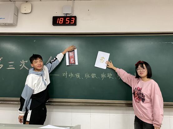 会议上,朱伟鹏和团支书吴湘楠给大家展示了备选班旗、班徽、班服,向大家介绍了它们的构成要素以及象征意义,播放了备选班歌,大家对票选内容有了了解后踊跃发言,表达了自己的想法,并且有同学大胆提出了自己的创新性建议。在同学们共同参与下,会议在热烈的气氛中进行,最终通过举手表决确定了班旗、班徽、班歌、班服。