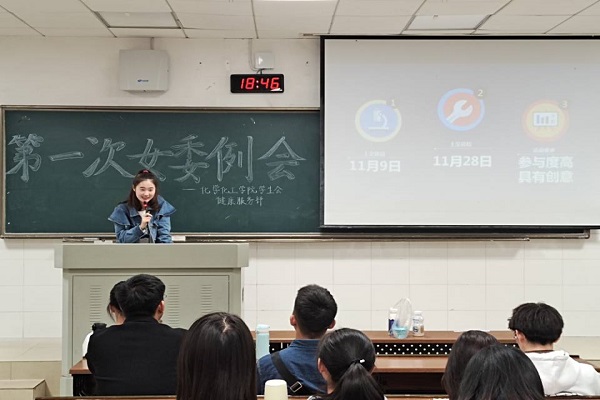 会议开始,女委群内通知并到场签到,参会人员按照年级顺序依次进行自我介绍,会议中,王萌萌介绍了18级、19级的校学生会和化工院男生节的活动内容、展示了相关图片,并分配了各位女委有关男生节的工作任务,此外,下发了化工院礼仪队招新的文件。会议最后,参会人员有序离场并整理教室。