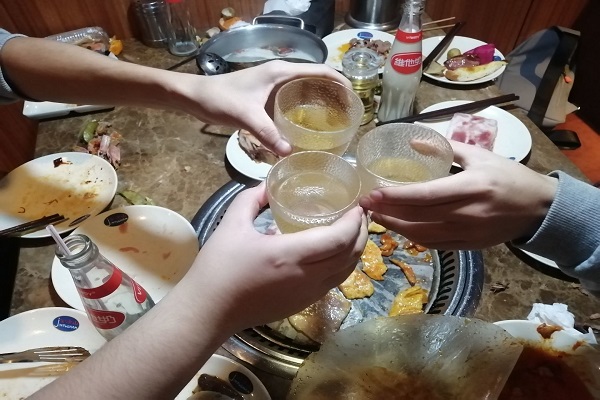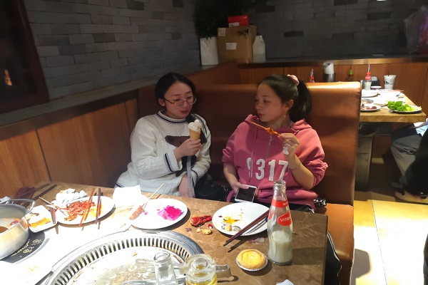 部分班委提前前往黄兴广场金釜山自助餐厅预定座位,并等待同学们的到来。18时整准时开始聚餐活动,班级同学分组分桌进行聚餐活动。现场气氛活跃,用餐过程中各个小组自行开始游戏娱乐环节。