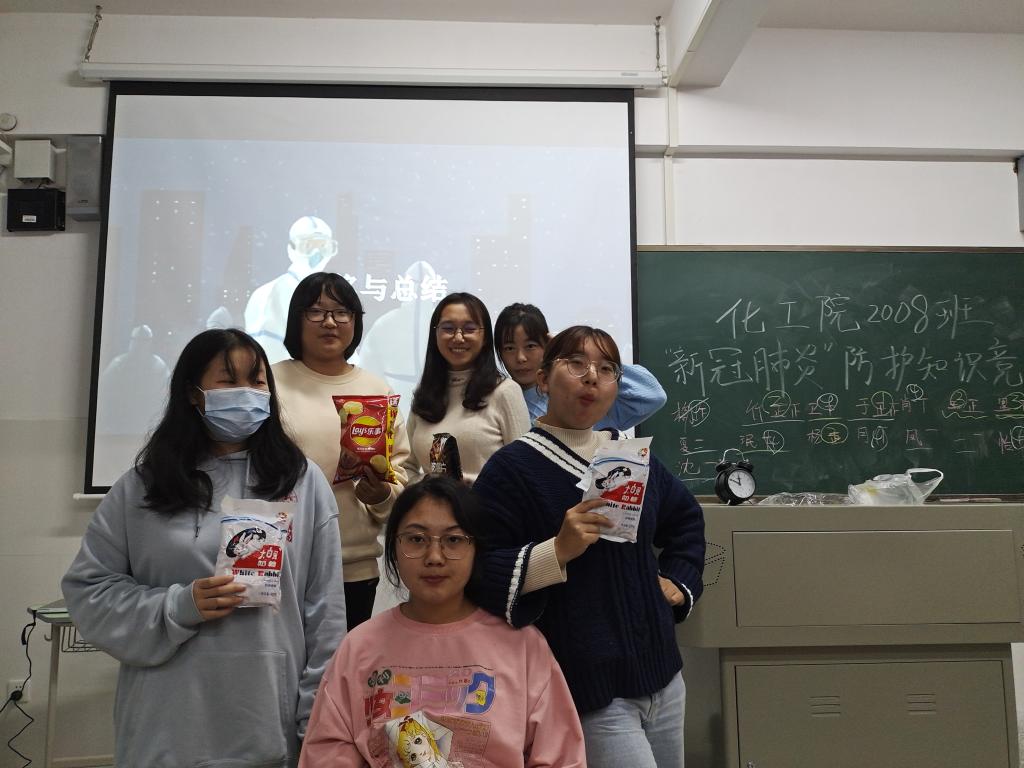 (通讯员 杨春艳)2020年11月16日19时化学化工院2008班宣传委员陈娟,团支书吴湘楠以及班长朱伟鹏组织全体同学于中和楼111室举行新冠肺炎防护知识竞赛。