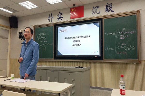 课例研修活动共分为八项流程。此次重点探讨的课例为化工院实习生刘湘所授公开展示课《铁盐与亚铁盐》,以魔术情景贯穿课堂,结合化学与生活的关系,逻辑主线清晰,一定程度上培养了学生的守恒观、变化观、转化观。展示课结束后,长郡梅溪湖中学校长刘欣致欢迎词,他对与会的全体领导老师以及实习生们表示欢迎,并向大家报告了学校的“两型”与“绿色”的办学理念。长郡梅溪湖中学化学组张勤、汤湘带领观察小组成员分别从两个方向,共八个维度对课堂进行观察记录与报告分享。张勤所在小组主要观察了课堂及时性评价的有效性,从教师对学生、学生对教师、学生对学生、学生对自己的四个维度进行报告,记录次数详实,结合观察小组建议对离子方程式的书写环节进行点评,周到细致。汤湘所在小组主要观察了课堂问题驱动的有效性,从课堂预设问题、生成问题、追问问题、其他问题驱动四个维度进行分享,强调了教师设问的艺术,对实验设计环节生成问题的导出提供了自己的想法与意见,充分中肯。长郡梅溪湖中学化学组肖华进行了《基于核心素养目标下的中学化学深度教学》主题微分享,一起学习了新课标及新高考评价体系,探讨了核心素养下的深度学习,从过程线、知识线、任务线、素养线四个方面对近期三堂《铁盐与亚铁盐》同课异构进行了对比分析,有理有据,并结合自身的教育教学经验谈及了对教师行业的心得体会。随后,化工院张效敏对此课例进行了点评,主要谈到了实习生刘湘实习前后在板书、课堂设计、教学能力等方面的提高。活动接近尾声,化工院实习队带队老师张超,长郡梅溪湖中学高一化学组杨焱上台进行阶段性总结,张超对长郡梅溪湖中学给予实习生的锻炼与关心表示感谢,杨焱用“教学相长”四字总结此次实习,结合师大“仁爱精勤”与长郡梅溪湖中学“朴实沉毅”的校训,以师兄的身份亲切地对每一位实习生进行了记录与评价,并表达了对实习生的衷心祝福。最后,化工院副院长谭亮进行总结性讲话,他分享了自己参与此次活动的感受,充分肯定了此次活动的创新形式与显著收获。