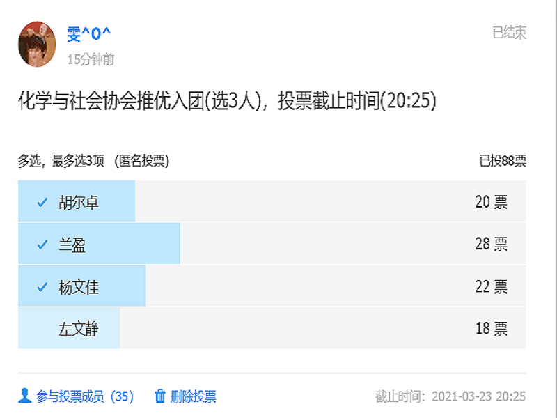 (通讯员 张淑雯)3月23日下午20时整,化工院化学与社会协会团支部召开推优入团会议。会议以线上选举投票方式进行,由化学与社会协会理事长张淑雯主持,参会人员为化学与社会协会全体会员。