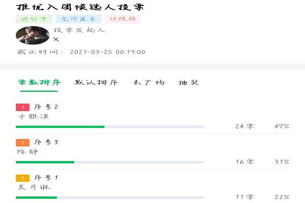 推优入团大会开始,徐新宇介绍了此次会议的基本流程,同时公布了候选人名单。候选人按照顺序依次发言,表达了她们对此次推优入团的机会的珍惜,以及想要进入团校学习的决心。全员进行匿名投票,最终选出进入团校学习的两名同学,她们分别是于雅淇和陈静。