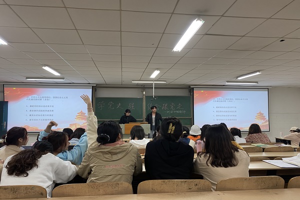 班导师刘建兵向同学们分享小时候吃地瓜的故事,告诉同学们要孝敬父母。同时,刘建兵指出:国家正在变强,尤其在最近的外交事件上体现了中国社会的进步、党的伟大。接着团支书余益根分享了党的红色精神与章程、讲述了自己的红色故事,同学们从中学习到了敢为人先、不惧磨难的红军精神。