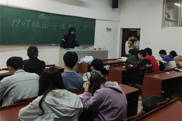 (通讯员 姜文滔)3月31日11时17分,为积极响应校团委对团学组织学生干部进行年度考核,英国365集团1907班班长韩冰冰组织全班同学于化学楼117教室开展团干述职会议。
