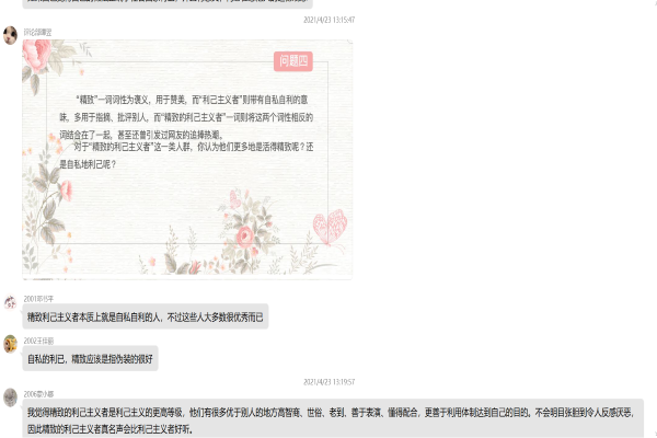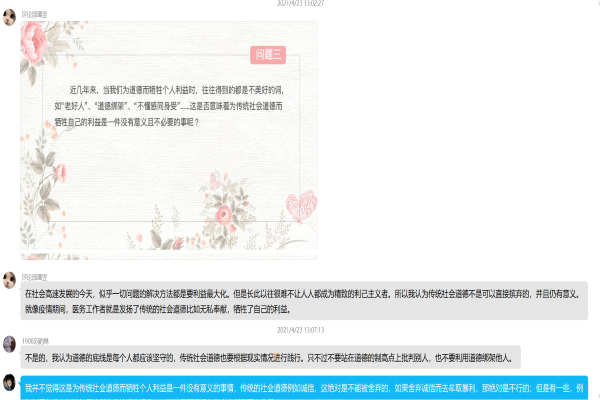 此次活动让同学们对传统社会道德与个人利益之间的问题有更客观的看法,交流讨论不同的见解,探讨二者产生冲突的原因,并分析其带来的影响以及可行的解决办法。
