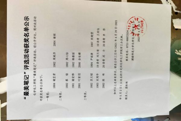 此次评选活动通过组织各班同学从自己相应科目的笔记中选取十页进行复印或拍照打印再上交学工办的形式收集各年级同学的笔记,共从学院数名学子中收集到笔记几十份,再经各年级辅导员评选,最终各年级均评出一等奖1名、二等奖2名、三等奖3名,获奖名单已公示至化工院大厅。