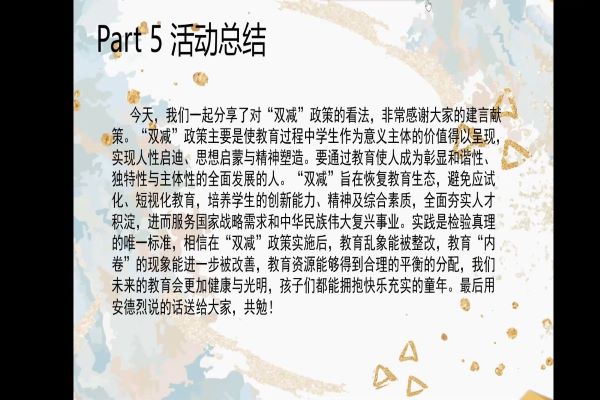 此次活动让同学们从不同的角度分享了对“双减”政策的看法,并结合“双减”政策实施以来的具体情况,探讨了如何更好地落实和推动“双减”政策的实施。