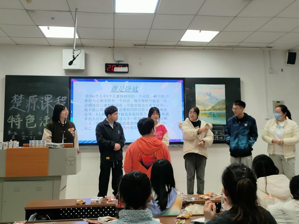 活动之始,许多同学分享了自己上生活文化课程的学习成果,总结了上课期间的感悟和体会,并且表达了对课程未来的期待之情。曾小龙带领同学们开展了报数猜名、心口不一、你“化”我猜等一系列游戏,在游戏过程中,同学们都很积极踊跃地回答问题,努力为小组赢得积分。游戏结束后,积分排名前三的小组获得了奖品,积分排名最后的小组接受了惩罚。