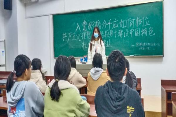 活动伊始,组长金佳会主持活动,再次强调了党课的纪律与要求,提出小组成员应该积极参加活动。随着活动的展开,金佳会提出问题,入党积极分子应如何树立共产主义理想,积极投身于建设中国特色社会主义伟大事业。小组成员王欣提出,入党积极分子坚定共产主义理想,就是要把共产主义理想同党在现阶段的奋斗目标结合起来,为共产主义而奋斗。 其他小组成员也依次提出自己的看法。在金佳会的总结中结束了此次讨论活动。