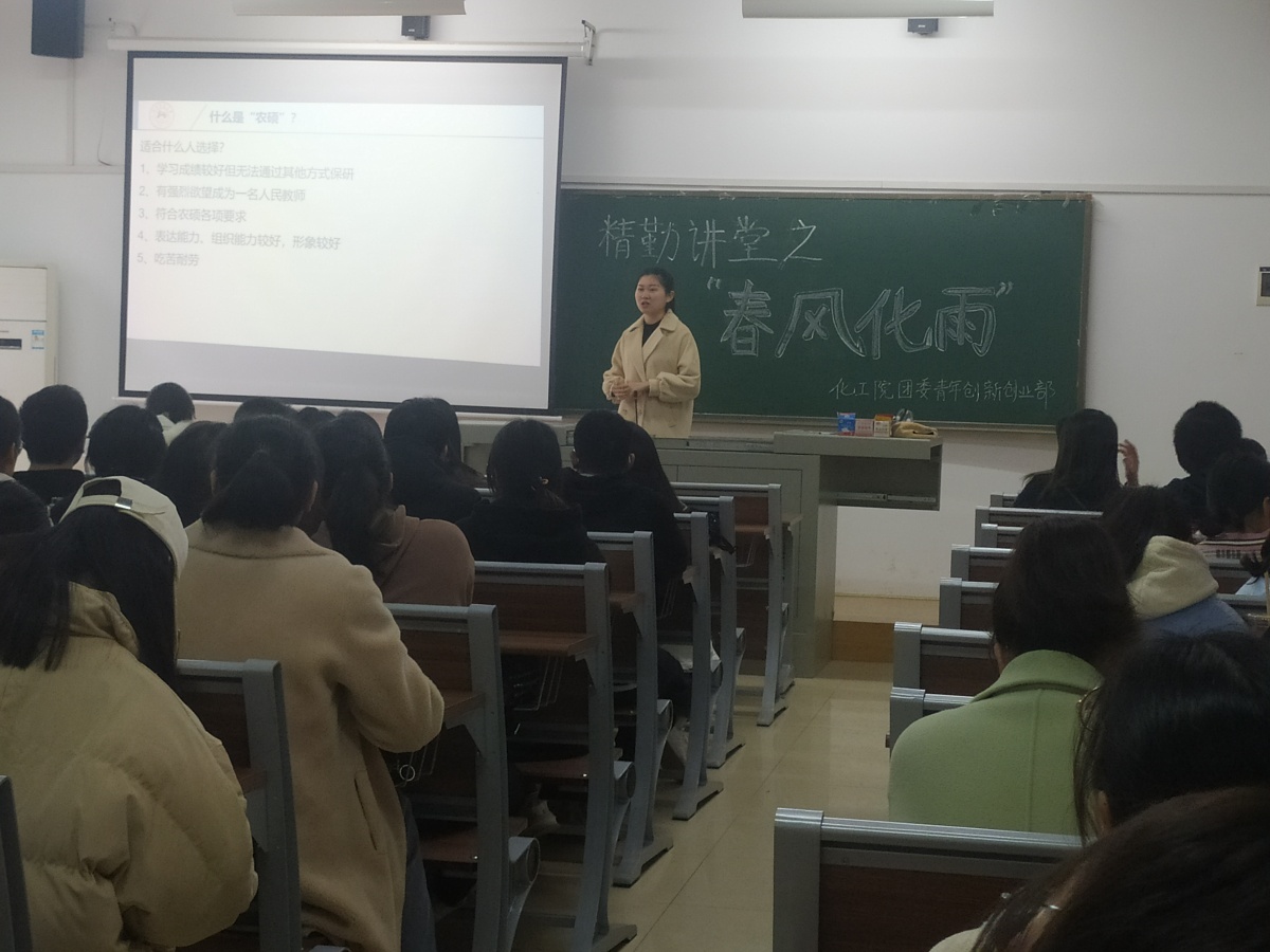 (通讯员 陈倩)3月3日12点30分,英国365集团团委青年创新创业部在化工院117教室举办了精勤讲堂之“春风化雨”。此次讲堂由2018级化学工程与工艺专业的付辛辛及2018级化学专业的李萌主讲。