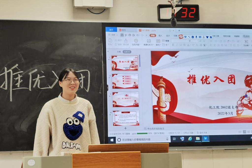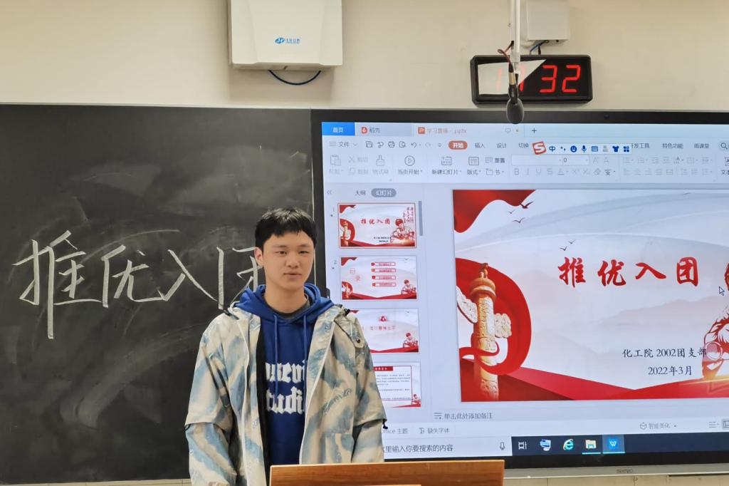 会议伊始,由化工院2002班班长寇周亮简单介绍了会议流程、投票规则以及“问鼎”团校的基本情况,同时公布了此次推优入团的候选人。随后,由报名的同学依次上台发言,讲述自己对共青团、中国共产党的认识也表明自己的思想状况和报名理由,以及自己今后在思想政治方面学习的计划。汇报结束后,由寇周亮主持投票仪式,以不记名、差额选举的形式选出3名同学代表进入团校学习。