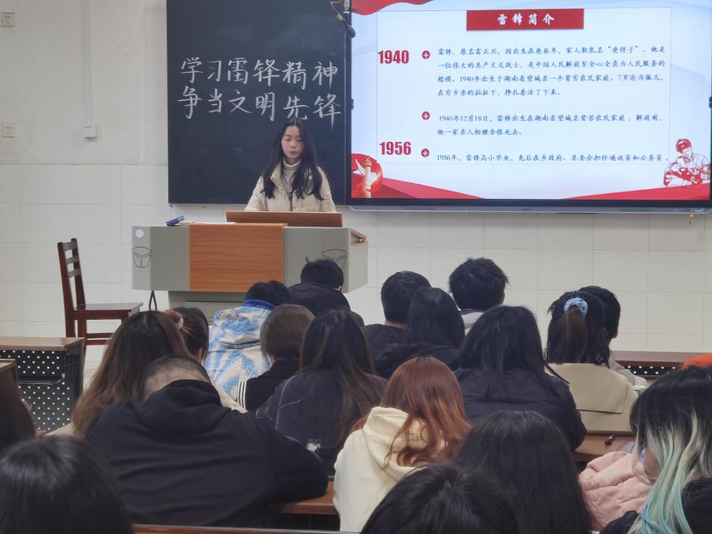 活动开始,由化工院2002班团支书陈琦主持进行雷锋精神的演示文档的讲解,内容主要包括:简介雷锋生平、讲述雷锋事迹、学习雷锋精神、致敬雷锋同志四个部分。介绍期间,陈琦进行了有关雷锋精神的知识问答,提问期间,有两位同学积极地进行相关问题的回答。