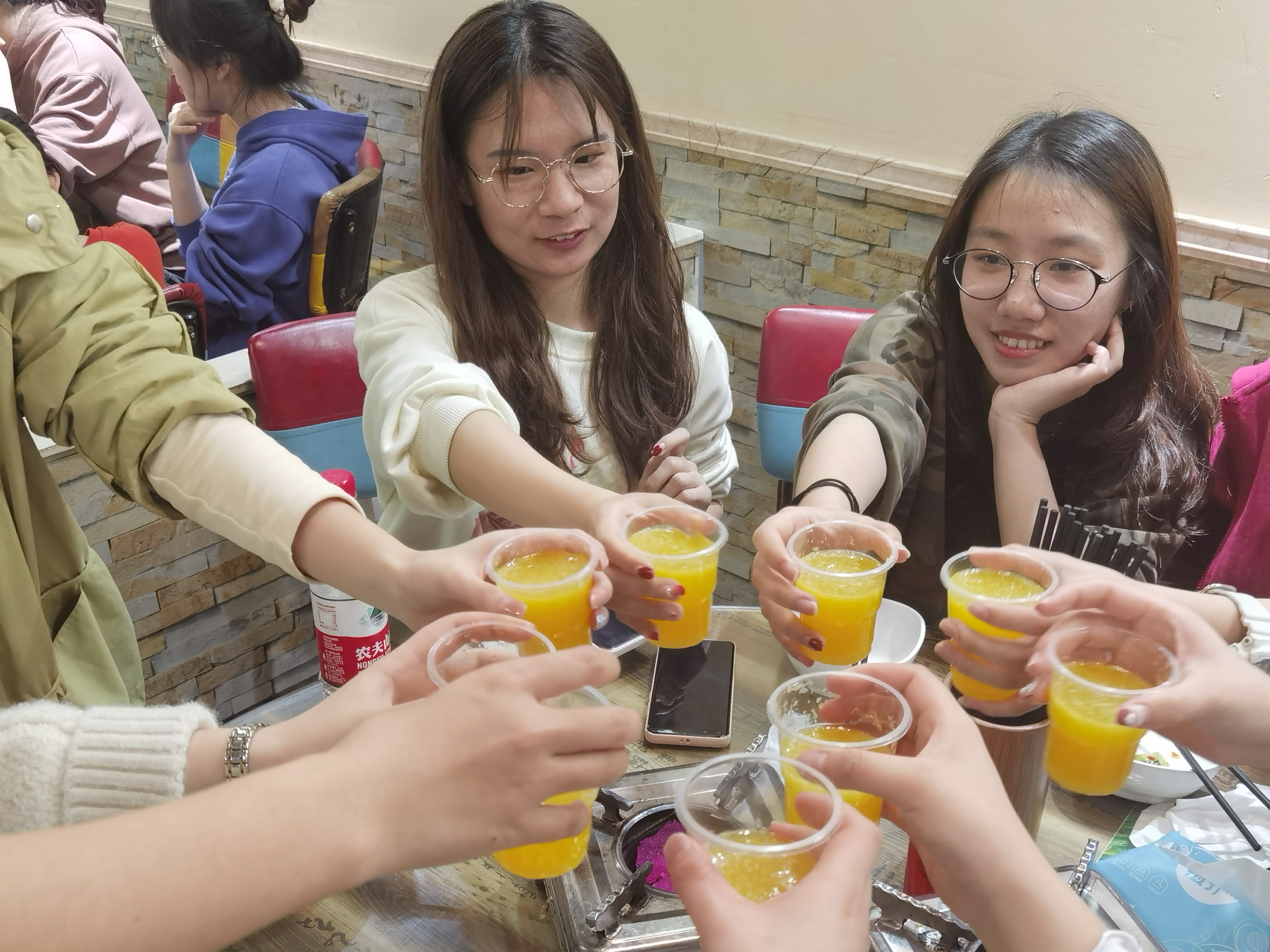经历了两个半小时的爬山,同学们又累又饿,为此,班干部决定在离南门口不远的老湘菜餐馆一起聚餐。大家坐在一起,在等上菜的过程中聊着在爬山时遇到的稀奇事,也有在讨论下一次去哪儿玩儿,还有的在期待着女生节礼物。上菜后,大家碰杯,并合影留恋。之后,在返回学校的路上,2002班成员又在湖南大学毛主席石像旁进行了一次大的合影。