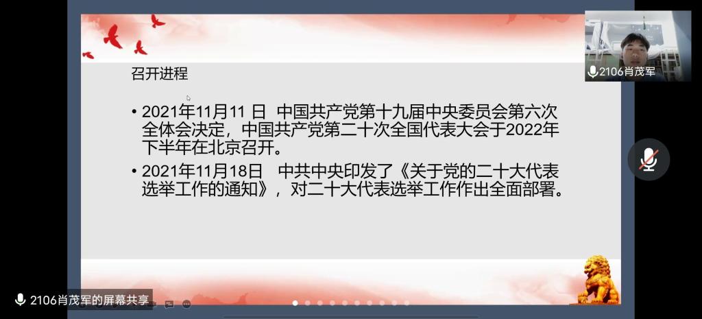 (通讯员 刘毅)2022年3月30日12时30分第十二届“问鼎团校”第二期理论学习第三课在线上开展。此次团课主题为“与时俱进跟团走,百年奋进展新颜”,与会人员为团校全体成员及院团委青年发展工作部全体成员。