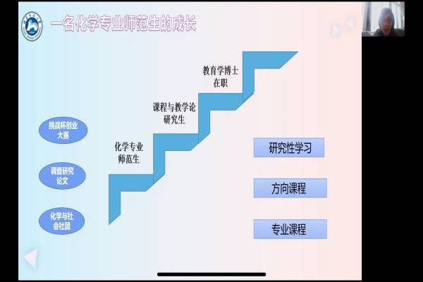 在此次线上活动中,景一丹主要介绍了化学专业师范生的自我成长路径。景一丹提出,作为一名化学师范生,会经历从化学专业师范生到课程与教学论的研究生再到教育学的在职博士生的转变,在成长过程中,学生可以选择参加挑战杯创业大赛,撰写调查研究论文,以及参与到化学与社会社团中,在学习知识的同时,丰富自己的沟通交流能力以及相应的实践技能。