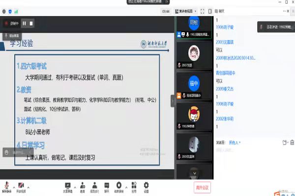 会议过程中周敏分享了自己对于四六级考试和计算机二级考试的学习经验,同时详细介绍了全国大学生化学实验创新设计竞赛的相关内容,并且展示了参赛视频让同学们印象深刻,这让同学们对于该赛事有了更加深刻的理解。