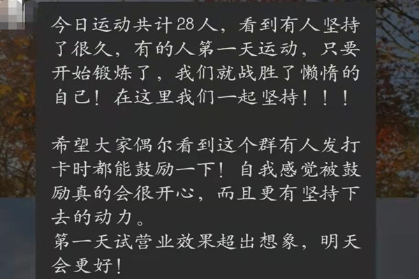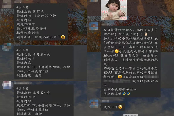 许多同学积极参与此次活动,分享锻炼成果、互相鼓励,形成良好的运动氛围。其中不少同学取得了很大进步:从不运动到动起来、从坚持不住到坚持下来、从“舒适圈”走出来突破自我……在活动进行过程中,学生会文化兼体育部成员积极回答同学们与锻炼相关的问题,同学们彼此之间也会互相答疑解惑,营造了良好的活动氛围。在2020级辅导员欧阳唯一、2021级辅导员张婧和文化兼体育部成员的呼吁下,同学们也积极记录自己的锻炼日常,响应校内“运动不打烊,‘疫’起动起来”活动。