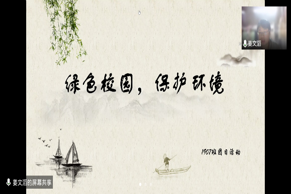 此次活动由班长姜文滔主持。活动伊始,姜文滔播放PPT,并介绍保护环境的重要性。活动期间,姜文滔通过共享屏幕播放视频:《绿水青山就是金山银山》与《山水之恋》。活动最后,姜文滔对本次活动进行总结,并指出作为新时代大学生,我们应当积极树立环保意识,坚定可持续发展战略,从小事做起,绿色消费,保护校园。