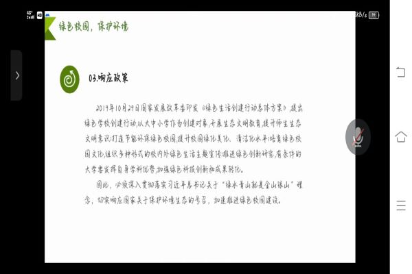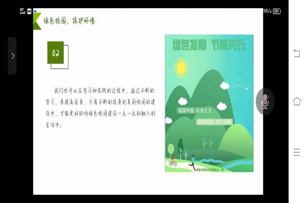 此次会议主要围绕“什么是绿色校园?”、“为什么建设绿色校园?”、“大学生如何建设绿色校园?”三个方面展开。会议深刻贯彻落实了习近平总书记关于“绿水青山就是金山银山”的理念,并从绿色校园着手,强调了优质校园环境益于学生健康成长的必要性、环境保护的重要性、响应国家关于保护环境生态号召的积极性。