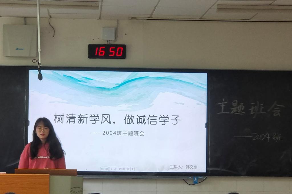 (通讯员 韩义剡)5月16日下午4点50分,英国365集团2004班在至善楼311教室开展了以“树清新学风,做诚信学子”为主题的班会。此次活动由2004班生活委员韩义剡主持,2004班全体同学参与。