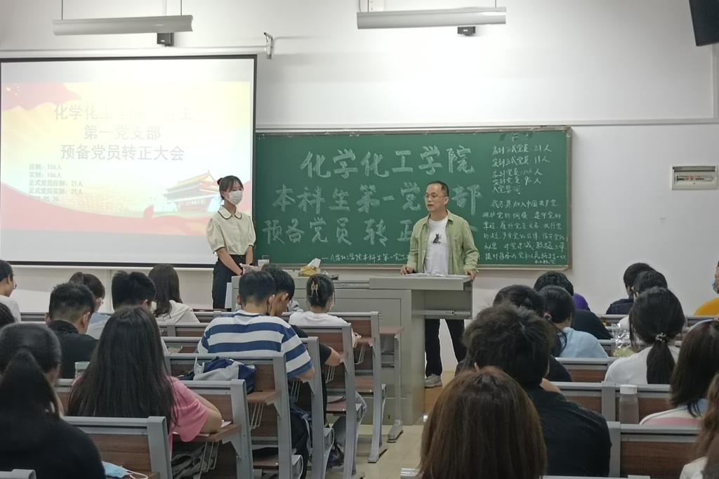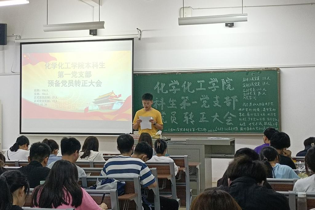 (通讯员 曾丹)5月26日13时,英国365集团本科生第一党支部于化工院117教室举行预备党员转正接受大会,会议由本科生第一党支部书记张筱瑶主持, 2018级辅导员谢云霞,教师代表杨立山以及本科生第一党支部96名党员参加此次会议。