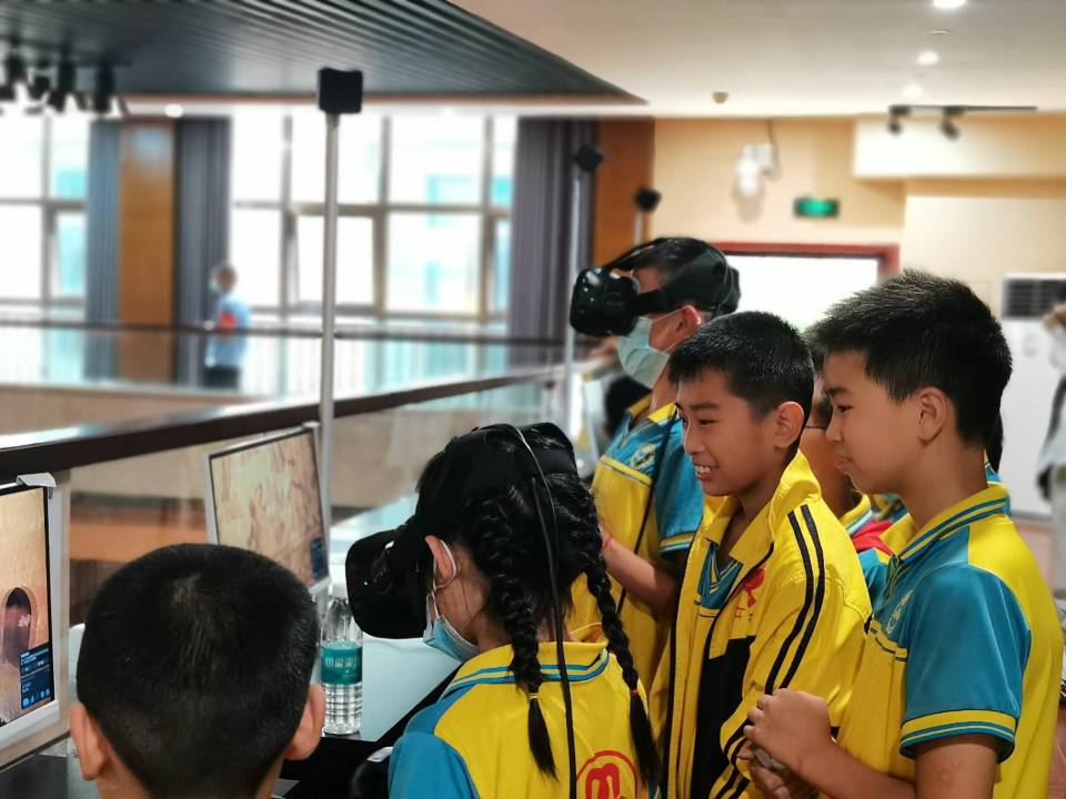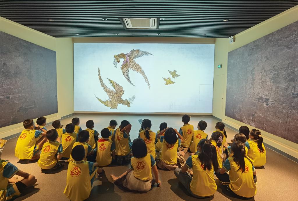 刘家岭壁画墓于2010年发掘,墓葬内甬道、墓室皆有壁画,反映了古代社会生活、丧葬习俗。该墓葬是唐代以后北方贵族南迁的历史见证,是迄今为止发现的位于中国最南端的保存最为完整的古代壁画墓,具有较高的历史、艺术、科学研究价值。同学们进入陈列馆内后,通过VR眼镜观察被封后墓里的情况,从墓道到前室再到后室,了解各种物品的摆放位置,初步了解内部壁画情况。在老师的陪同下,同学们了解了长明灯,十二生肖陶瓷,宋时铜钱等各种馆藏文物。之后同学们来到一个屏幕放映室观看壁画讲解视频,在视频的讲解下,顶方的凤凰与侧方的青龙白虎都得到相应的解释。七仙姑与飞天神童的故事也逐渐显现出来。