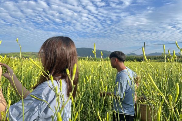 在和当地农户沟通后,调研小分队与农户一同深入黄花菜地。队员张振坤与农户进行交流询问,了解了目前黄花菜种植的真实情况以及黄花菜的生长习性。当今,官家嘴镇青壮年劳动力大量外流,黄花菜大多由中老年人种植,农户们为了不错过黄花菜的采摘时间,必须得每天采摘3个小时以上。交流结束后,小分队成员亲身体验采摘黄花菜的过程,帮助农户进行采摘。