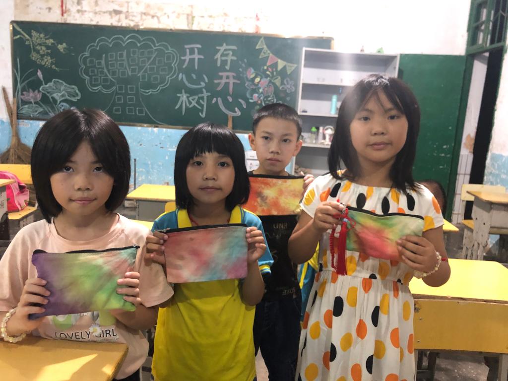 课程讲述完毕后,孩子们在志愿者和老师们的帮助下开始动手扎染。首先是扎的部分,孩子们拿橡筋将需要扎染的布包捆扎好,等待上色。朱鑫芳强调在对布包进行染色需要注意色彩搭配和上色技巧。孩子们将染好的布料用自封袋封好,等待24小时后染色完毕。