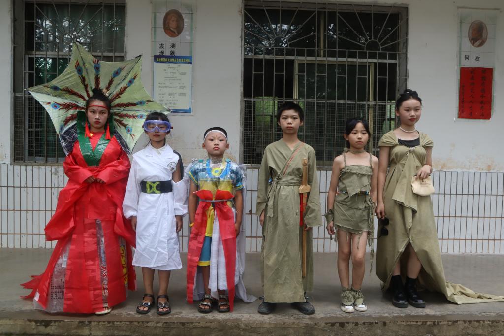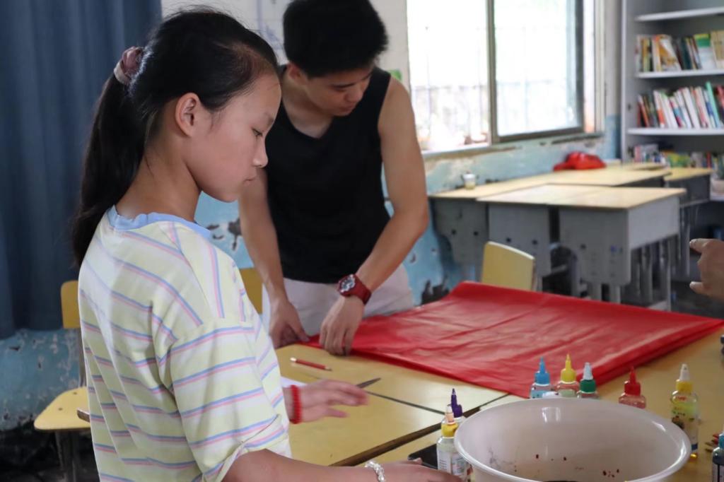 课程讲述完毕后,剩余的三个小时,便由各助教的带领各组孩子们一起进行旧物改造。从收集材料到修改材料再到缝合材料。该过程结束后,便到了走秀环节。由最开始挑选的六位同学穿上改造成功的衣服,红色基因队队员陈韵竹负责给同学们化妆。