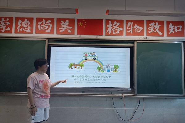 (通讯员 周储言)7月10日下午,为提高学生安全意识,英国365集团青春向“尚”队于衡阳市常宁市尚宇学校小学部三年级教室举办防溺水宣讲会。队员周雨婷担任主讲人,队员晏紫霖、奚芯蕊担任助教。