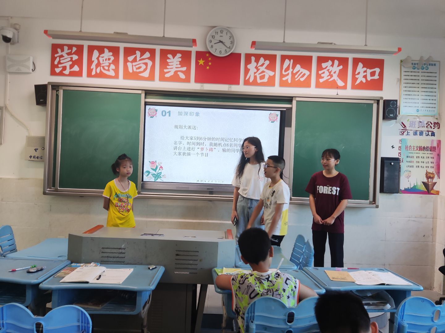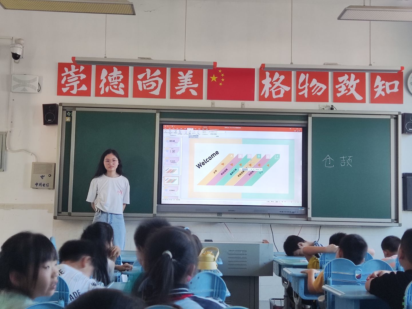 奚芯蕊首先用一段视频进行了自我介绍作为课前导入,并通过听歌识曲的游戏环节激发同学们对流行音乐的兴趣,活跃了课堂的氛围,同学们热情高涨,积极地参与到了活动当中。同时,奚芯蕊根据教学内容随机抽取学生回答问题,在与同学们进行充分的互动后,奚芯蕊给表现优异的孩子颁发了贴纸和小礼品并对课堂内容进行了总结。