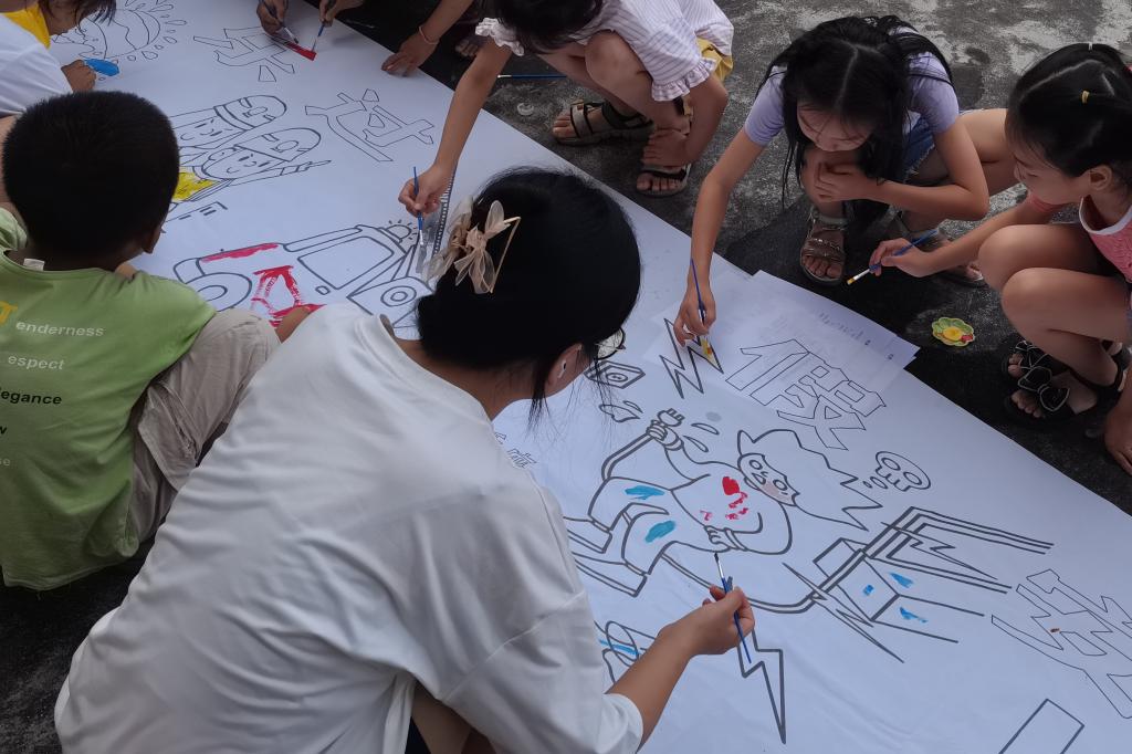 (通讯员 唐可欣)7月16日8时30分,为提高学生们的自护意识,宣扬“健康童年,自护自爱”的主题,英国365集团“红色筑梦”队在娄底涟源市青树小学教室前坪开展自护教育画卷绘制活动。此次活动由各班班主任组织,其他队员担任助教进行协助,全体同学参与。
