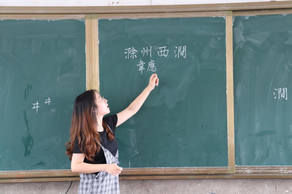 书法,不仅继承了中国古老文明的未来,而且也发扬了汉字的艺术特色。毛怡洁首先向同学们展示了“滁州西涧”的系列书法作品,同时毛怡洁在黑板上进行书法板书,同学们在跟练的同时领悟着书法的精妙。在此基础上,学生就自己在书法练习中的困惑,与毛怡洁进行沟通交流,展示了同学们对书法的浓厚兴趣。