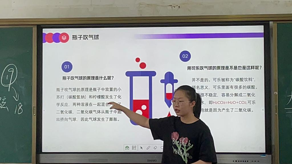 余思宇选取了四个生活中的化学事例:瓶子吹气球、溶洞形成、自热火锅、水垢。余思宇首先提出问题“瓶子怎么能吹气球呢”引发同学们的思考和激烈的讨论,通过一段视频,引出了瓶子吹气球的原理。还将家中可用来制作瓶子吹气球实验的原料告知同学们,并鼓励他们自己动手尝试。接着通过展示安化县马路镇特色景点龙泉洞的照片,余思宇引入溶洞,并教授学生溶洞的形成过程,让同学们对家乡美景的形成有了进一步认识。
