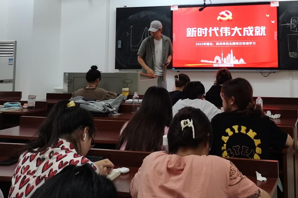 团课期间,赵一阳先以“中国共产党带领中国人民写就了一幅幅壮阔恢宏的答卷”作为此次团课的前言,从总体上为大家介绍了中国共产党的杰出贡献。紧接着,赵一阳从国防和军队建设、坚持“一国两制”和推进祖国统一、维护国家安全、社会建设、生态文明建设、全面依法治国、全面从严治党七个方面详细介绍了中国共产党在新时代的伟大成就。最后由同学们进行心得体会的分享。