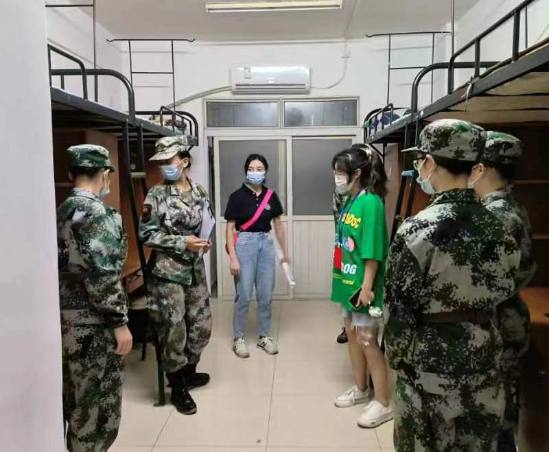 当教官和辅导员们走进同学们的宿舍时,同学们整齐的站在宿舍两旁,热情地迎接,教官们、辅导员们和同学们进行亲切的交谈,并对内务要求做了详细指导,指出宿舍内务的一些不足之处,希望大家做到更好。同时,辅导员们还对同学们进行了慰问,希望大家能克服军训期间的种种困难,坚持下来,并把军训期间培养的好习惯一直延续下来,为以后的生活和学习以及工作打下坚实的基础。
