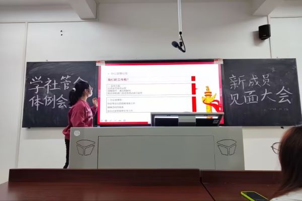 会议中,各位新老成员依次进行了自我介绍,自我介绍过程中,成员们分享兴趣爱好,表达对未来工作的期望。为使新成员了解各部门工作任务,学社管各部门负责人对其部门的主要职责及近期任务进行了简单介绍,各社团理事长也对其社团活动展开讲解,并汇报近期活动。学社管指导老师谢云霞对此次例会进行了简要总结,并在讲话中表达了对学社管各位成员们的殷切期望,希望全体成员能在学社管中锻炼、提升自我,成为更好的自己。