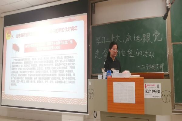中国共产党第二十次全国代表大会10月16日上午在人民大会堂开幕,习近平总书记代表第十九届中央委员会向党的二十大作报告。活动伊始,刘湉向同学们介绍了“党的二十大主题”、“中国式现代化”等党的二十大重要论述。学习贯彻党的二十大精神,习近平总书记强调了“五个牢牢把握”。刘湉强调,新时代青年践行“请党放心、强国有我”的青春誓言,在科技前沿、边关哨所、改革开放实践、脱贫攻坚战场、抗疫一线、抗洪救灾现场,在祖国和人民最需要的地方,冲锋在前、矢志奋斗,为新时代十年伟大变革贡献了青春力量,谱写了青春华章。活动期间,刘湉向同学们提出有关党的二十大的相关问题,同学们踊跃回答。