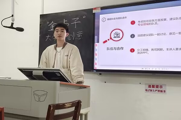宣讲会开始,安俊霖从自身的参赛经历出发,讲述了团队的参赛过程与获奖的原因,使同学们对创意大赛有了更深入的了解,同时激发了同学们参加创意大赛的兴趣。安俊霖分别从比赛介绍、如何选题、如何组队与合作等方面详细介绍了大赛的流程,为同学们了解大赛流程和注意事项作出了清晰的解读。宣讲会在同学们的积极提问和安俊霖的耐心解答中结束。