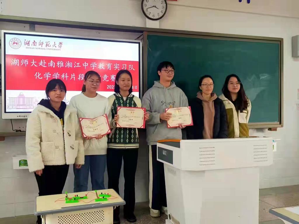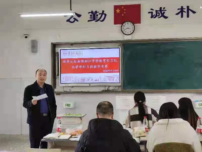 正式比赛前,各个选手抽签决定上场次序。9名实习老师依次上场,每位实习老师展示8分钟的片段教学。参赛教师们认真钻研教材,精心设计教案,反复磨课、研课、调整,以新颖的教学设计、巧妙的引导,将各自的教学风格和教学水平发挥得淋漓尽致,充分展示了化工院实习教师良好的精神面貌和扎实的专业素养。赛后,邓敏对9名选手的表现进行了细致专业地点评和总结,在教学方法、细节处理以及专业素养等各方面提出了中肯的建议和指导。曾佑林当场宣布获奖情况,南雅湘江中学化学组三位教师颁发各个奖项。