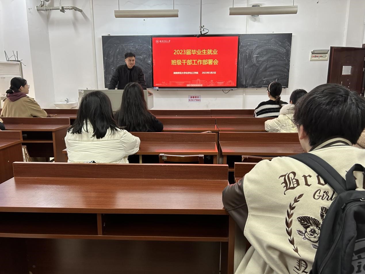 会议首先就当前就业形势和2023届本科毕业生目前就业情况进行了分析,并对毕业生就业工作进行了安排部署。唐健清指出,目前是春招高峰期,各大企业、中学对化学化工类专业毕业生需求较大,各班要加大对就业信息的宣传力度,鼓励同学们主动了解就业政策,珍惜应届毕业生的重要身份,有针对地投递简历,积极参加招聘宣讲会。唐健清强调,就业工作关乎每位毕业生的切身利益,各位班团干部要切实增强工作责任感,及时了解班级同学的升学、就业进展,引导同学们树立“先就业再择业”的观念;针对考研失败和就业存在困难的同学要及时关注其心理状况,了解其就业需求,引导同学们合理规划未来发展方向,群策群力推动更多未就业毕业生落实工作单位。