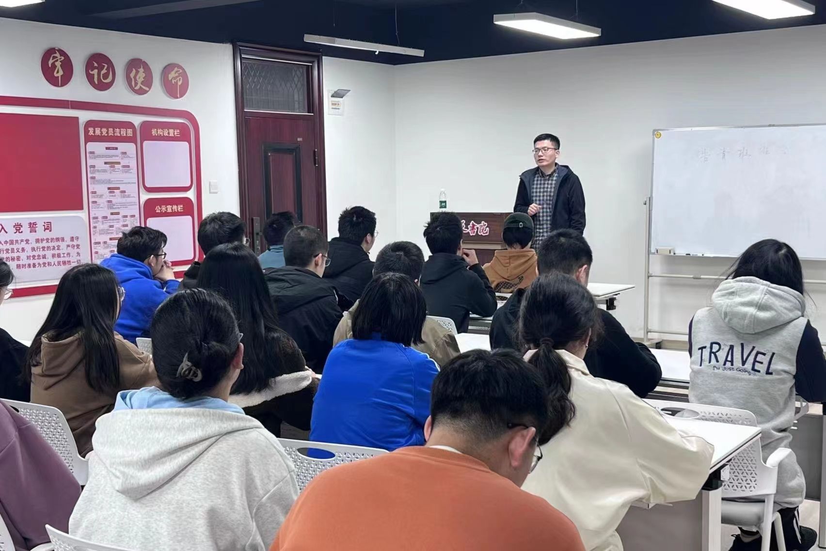 在班长李希致主持词之后,杨星老师对同学期末成绩进行分析,鞭策成绩不理想的同学并鼓励他们积极反思,调整学习状态。杨星老师关心关注同学们身体和心理健康,欢迎有任何生活和学习问题同学找他交流,并且以自身经历为例,激励同学们找到自己的道路,培养兴趣爱好,学习成绩优秀同学的学习态度与学习方法。接下来,杨星老师邀请成绩优秀的同学分享学习经验。罗梦薇从考前复习中学习资料的使用和查缺补漏的方法进行分享,强调要有踏实全面的学习态度;黄创伟建议提高学习效率,劳逸结合;夏文静从个人日常学习方法进行分享,认为要用一种持之以恒的态度面对学习,用积极的态度来解决学习生活中的困难,并且不断突破自我。最后,同学们积极讨论,寻找自我提升的方式方法。