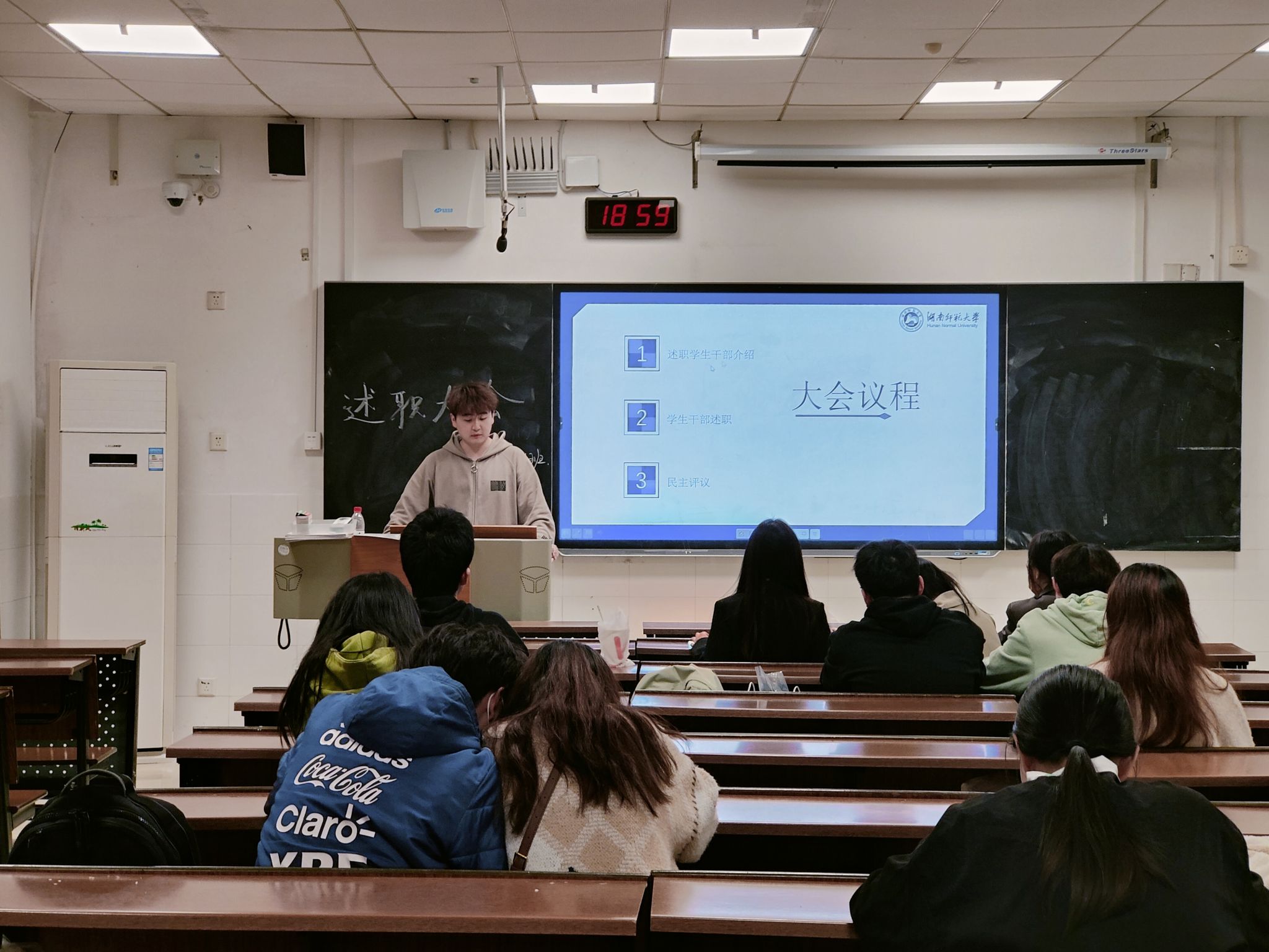 此次活动一共分为述职学生干部介绍、学生干部述职、民主评议三个环节。活动期间,谭杰文依次介绍了几位参加述职的学生干部的任职经历和获奖经历,并请其上台进行述职。学生干部结合过去一年的工作情况,对自己的工作做出总结与反思。学生干部述职结束后,由同学们对学生干部进行民主评分,谭杰文进行总结汇总。