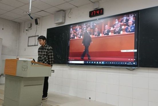 活动开展之前,李超做好了充足的准备,并告知同学们准时参加此次活动。为了活动的顺利进行,李超以PPT提问的形式让同学们主动地学习“两会精神”中的理论知识。李超从“认识两会”、“学习两会精神”以及“贡献青春力量”三个角度向所有同学全面地介绍了两会精神。
