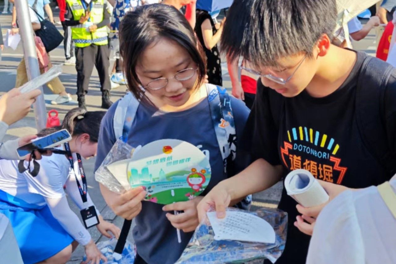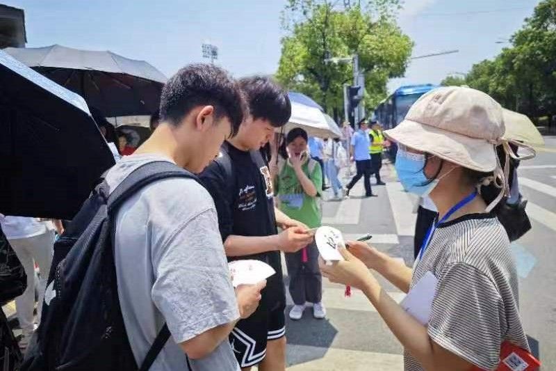 志愿者于6月6日中午在至善楼106教室提前制作了纸扇,有的在纸扇上自创祝福诗,有的画上卡通图画表达真诚祝愿,希望能缓解高考生紧张的心情、使其以平和的心态应对高考。志愿者分别在各科考试结束后,在英国365集团附属中学门前静待考生,进行纸扇赠送,为结束考试的考生们送上第一时间的祝福。考生收到纸扇时表示十分惊喜,并向志愿者们表达了感谢。