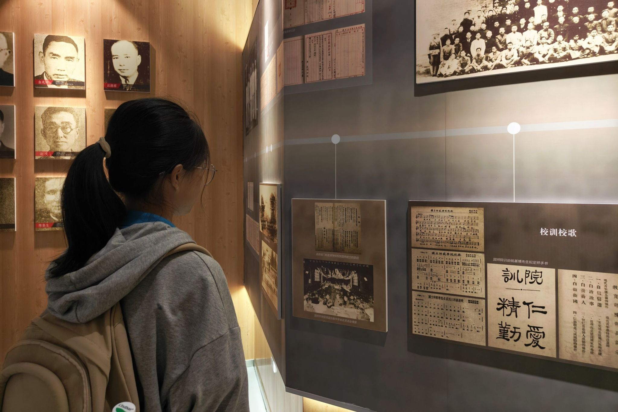 校史馆分为序厅、师范弦歌、鸿基初创、继往开来、发奋图强、携手共进、开创一流、桃李争妍和共襄盛典等不同的展区,各展区分别由讲解员张旭、黄嘉懿、刘欣冉、童秀华、王文弟、潘楚楚带领大家进行参观。通过他们的讲解,同学们直观地了解了学校的发展过程,切身体验了学校的沧桑与发展,看到了师大先辈在教书育人、文化传承、科学研究、服务社会等多方面所取得的成就和对社会的贡献,同时也深刻领略了“仁爱精勤”四字校训的精神内涵,体会到了师大独特的文化底蕴。