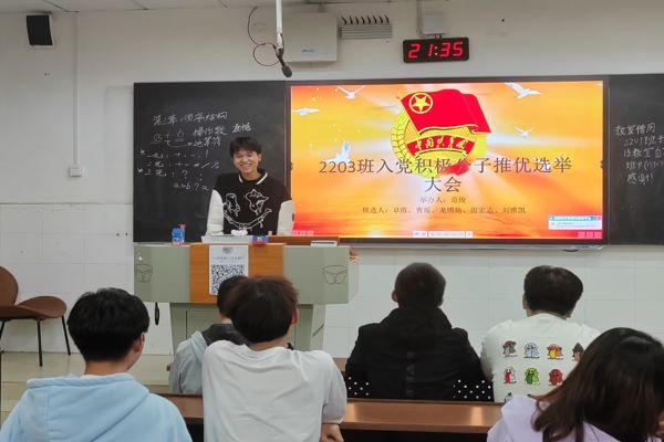 此次班会由2203班班长范俊主持,参与推优竞选的候选人有范俊、邓锋、易婕、谷钒、周佳、邓姣阳、匡紫薇、钟月平、向妮、李琴辉、郑红、孜拉来木•努力买买提共计12名同学。在此次班会中,范俊邀请了本班上一届入党积极分子培训结业的同学向大家讲解了推优入党的意义以及获得参加入党培训课资格的要求,讲解完毕后参与竞选的十位候选人依次上台进行了演讲。待所有候选人演讲完毕后,2203班全体同学开始投票,最终12位候选人均通过了此次选举,获得了本班同学们的认可。
